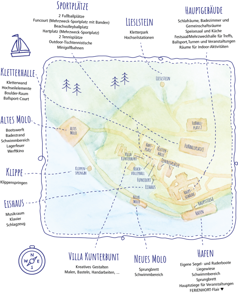 400.000 m² großes, vereinseigenes Camp-Gelände mit direktem Seezugang, Sportplätzen, SUPs, großer Bühne, Kletterwand, Kreativ-Werkstatt, Lagerfeuerplätzen und eigenem Bootshafen.